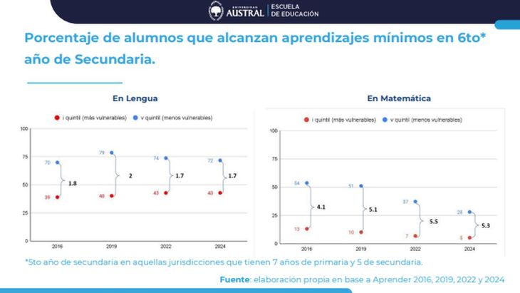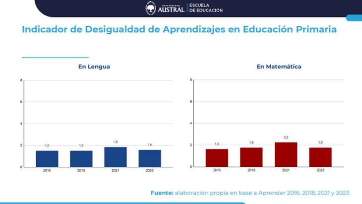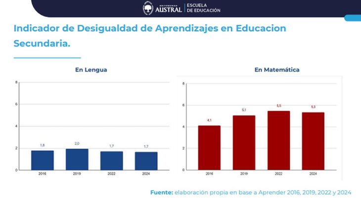El Tercer Informe del Indicador de Desigualdad de Aprendizajes de la Universidad Austral, elaborado por las investigadoras Eugenia Orlicki y Cecilia Adrogué, analizó el período comprendido entre 2016 y 2024 a partir de los resultados del Operativo Aprender. Los resultados mostraron un descenso pronunciado en la capacidad para adquirir conocimientos de Matemática en los alumnos con menores recursos, mientras que en lengua la brecha se mantuvo estable.
