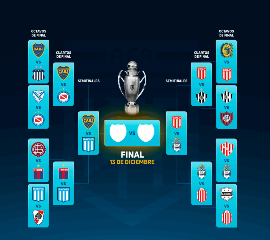 Del otro lado de la llave, Estudiantes de La Plata deberá enfrentarse a Gimnasia y Esgrima en una nueva edición del clásico platense con el objetivo de alcanzar la final en Santiago del Estero el sábado 13 de diciembre y convertirse en el nuevo campeón del fútbol argentino.
