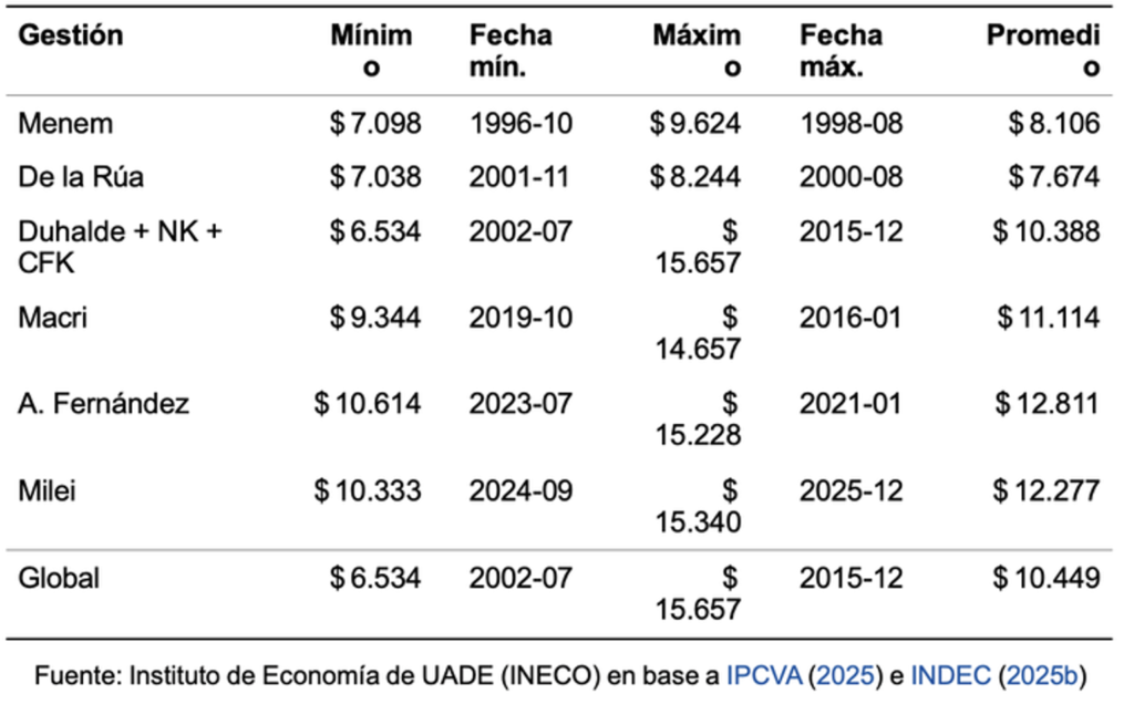 Entre 1996 y 2025, un salario promedio del sector privado permitió comprar 191 kilos de asado por mes. El máximo fue de 277 kilos en enero de 2008 y el mínimo de 116 kilos en diciembre de 2023. En 2024–2025 el promedio fue de 154 kilos, aún por debajo del histórico.