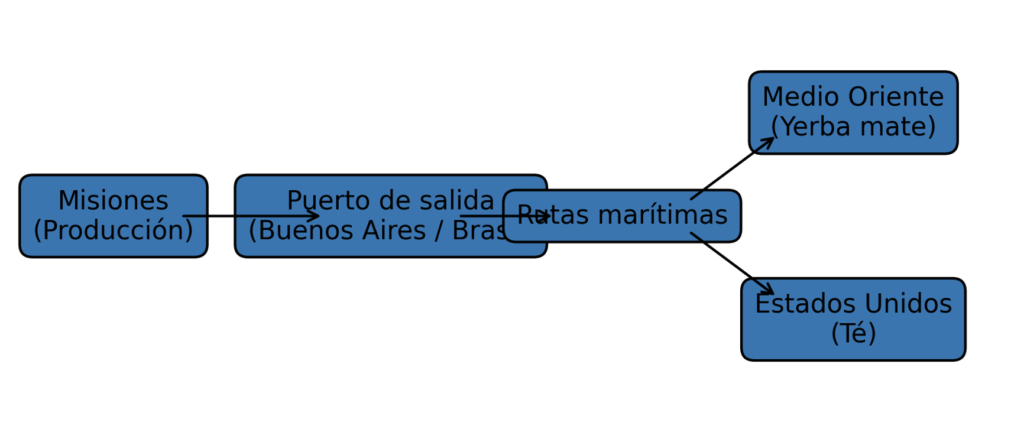Las exportaciones de yerba mate y té desde Misiones siguen un circuito logístico que conecta la producción regional con los principales puertos de salida y las rutas marítimas internacionales. La siguiente infografía resume de manera simplificada ese recorrido.