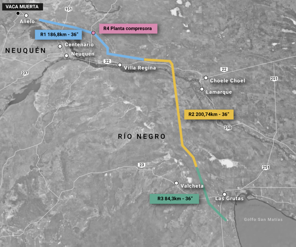 El gasoducto, licitado por el vehículo de inversión San Matías Pipeline, irá desde Tratayén, en Neuquén -en el “corazón” de Vaca Muerta- hasta el Golfo San Matías, en Río Negro, con una capacidad de transporte de gas natural de 27 millones de m3 por día (MMm3/d).